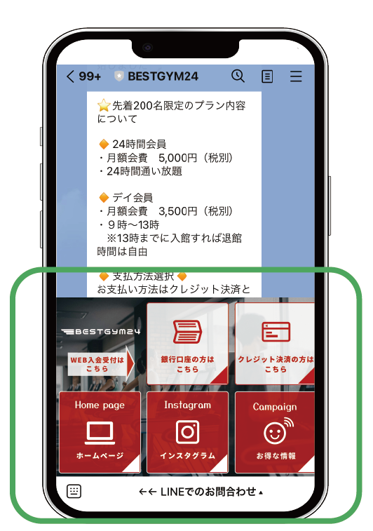 ジム会員へのお申し込みは「BESTGYM24公式LINE」内の申し込みボタンからになります。