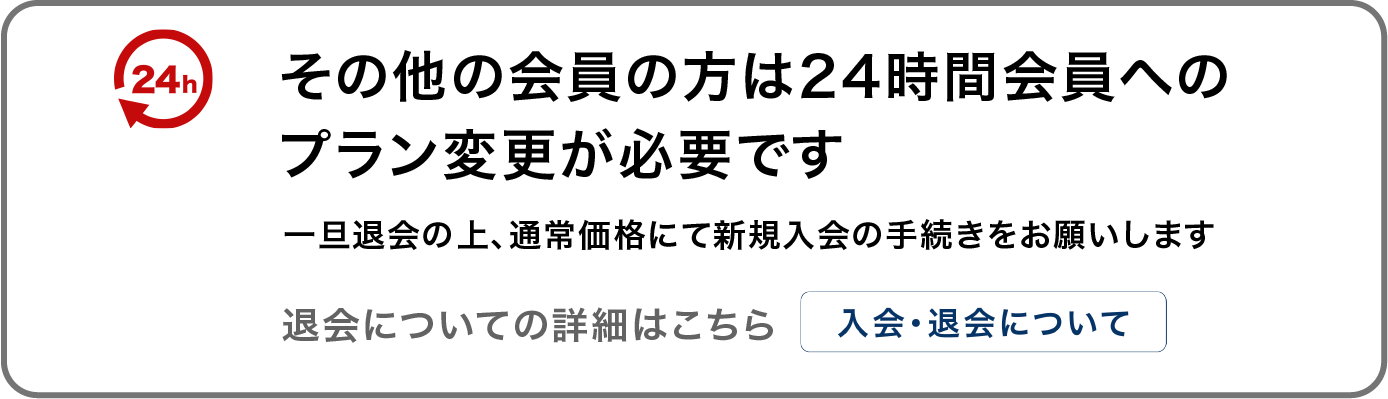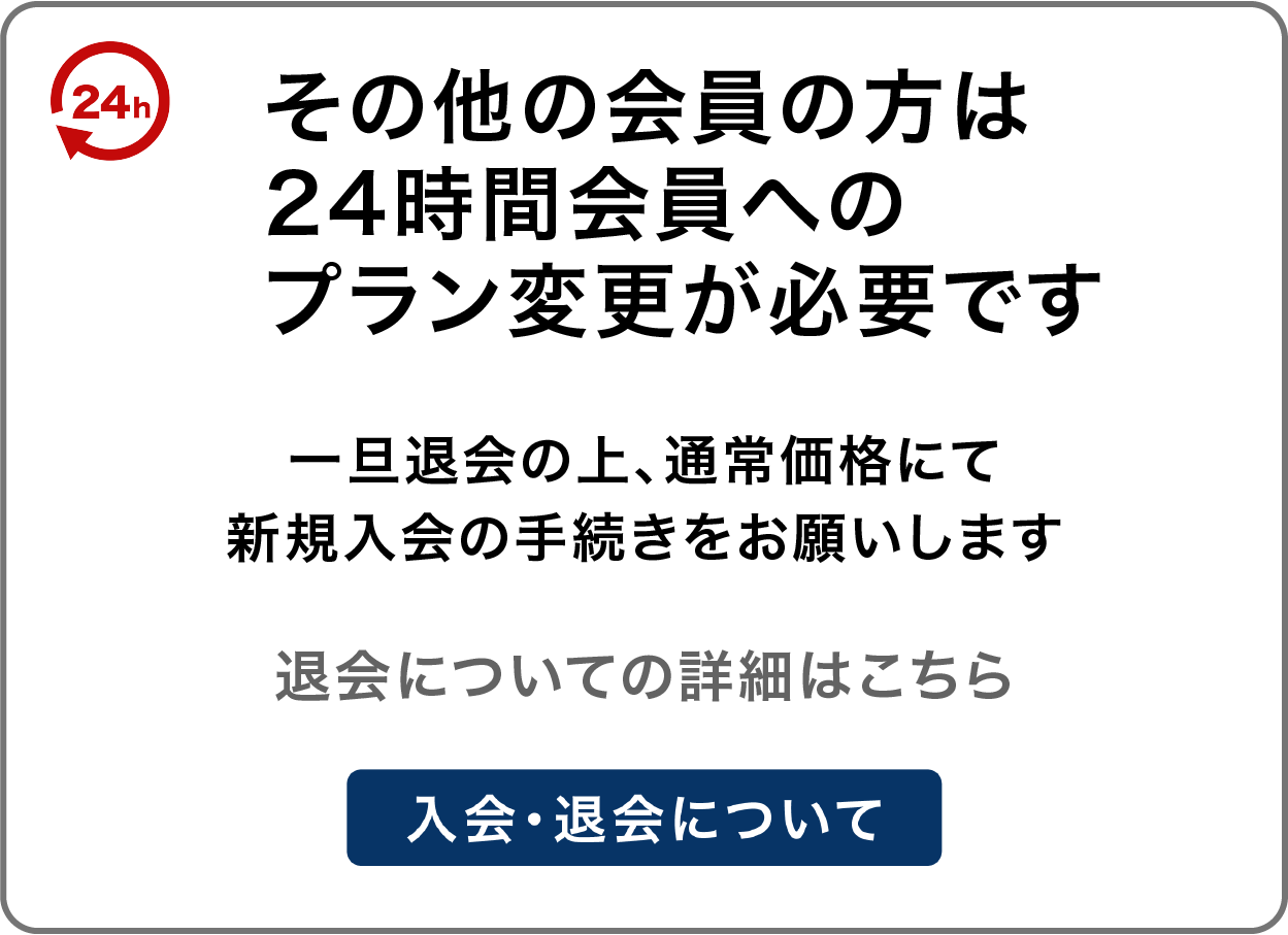 ・24時間会員以外の方は24時間会員へのプラン変更が必要になります。(一旦退会の上、通常価格での新規入会をお願いいたします)