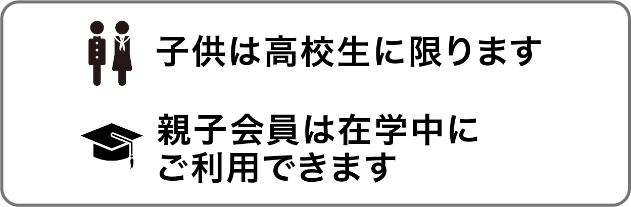本プランは、親御様がジム会員であることを条件にお子様が無料で利用できるプランです。お子様の安全を第一に考え、親御様が100%責任を持ってご利用いただくことを前提としております。安全確保と健全な利用促進のために、親御様の責任と協力が不可欠です。